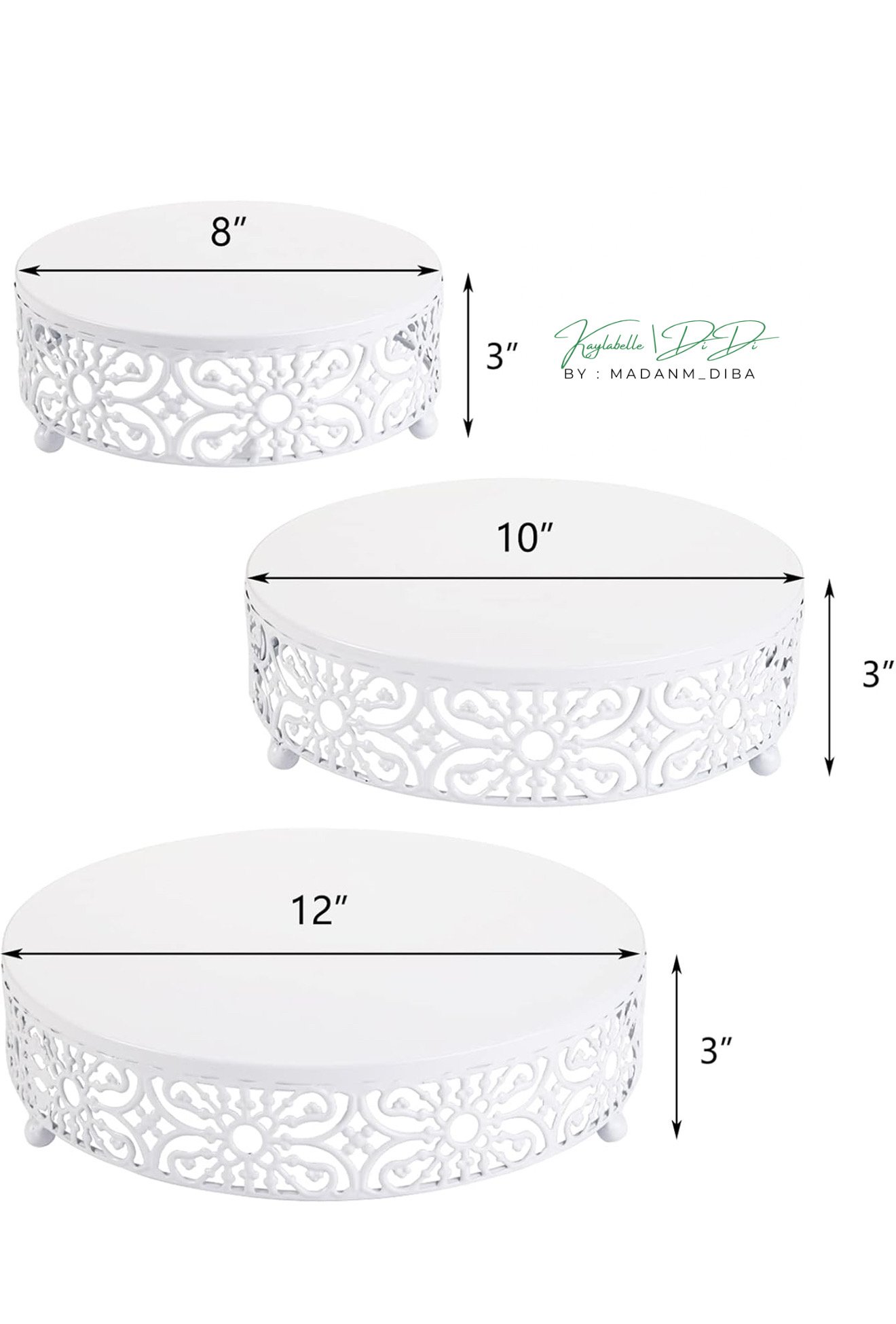 - Dimensions - Small to large: 8", 10" and 12" diameter plates, all stand at 2.8" tall.